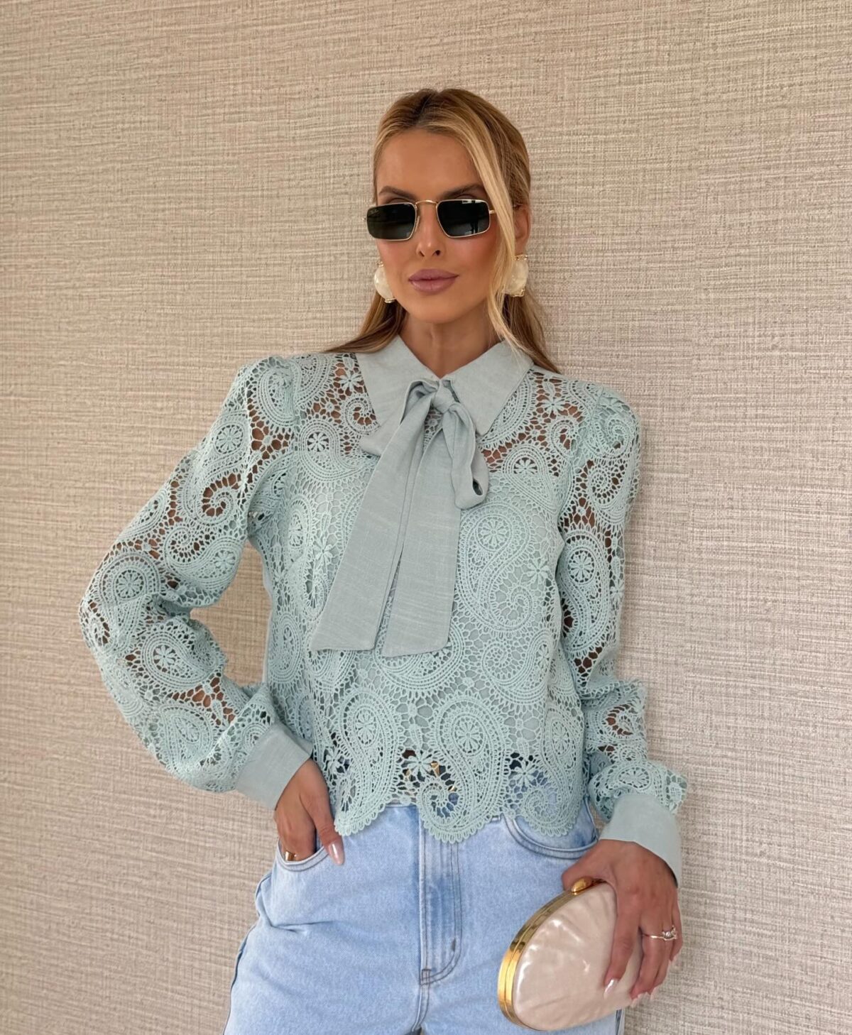 Camisa feminina em laise vazada verde agua com laco no pescoco. Manga longa, sofisticada. Disponivel em P, M, G e GG.