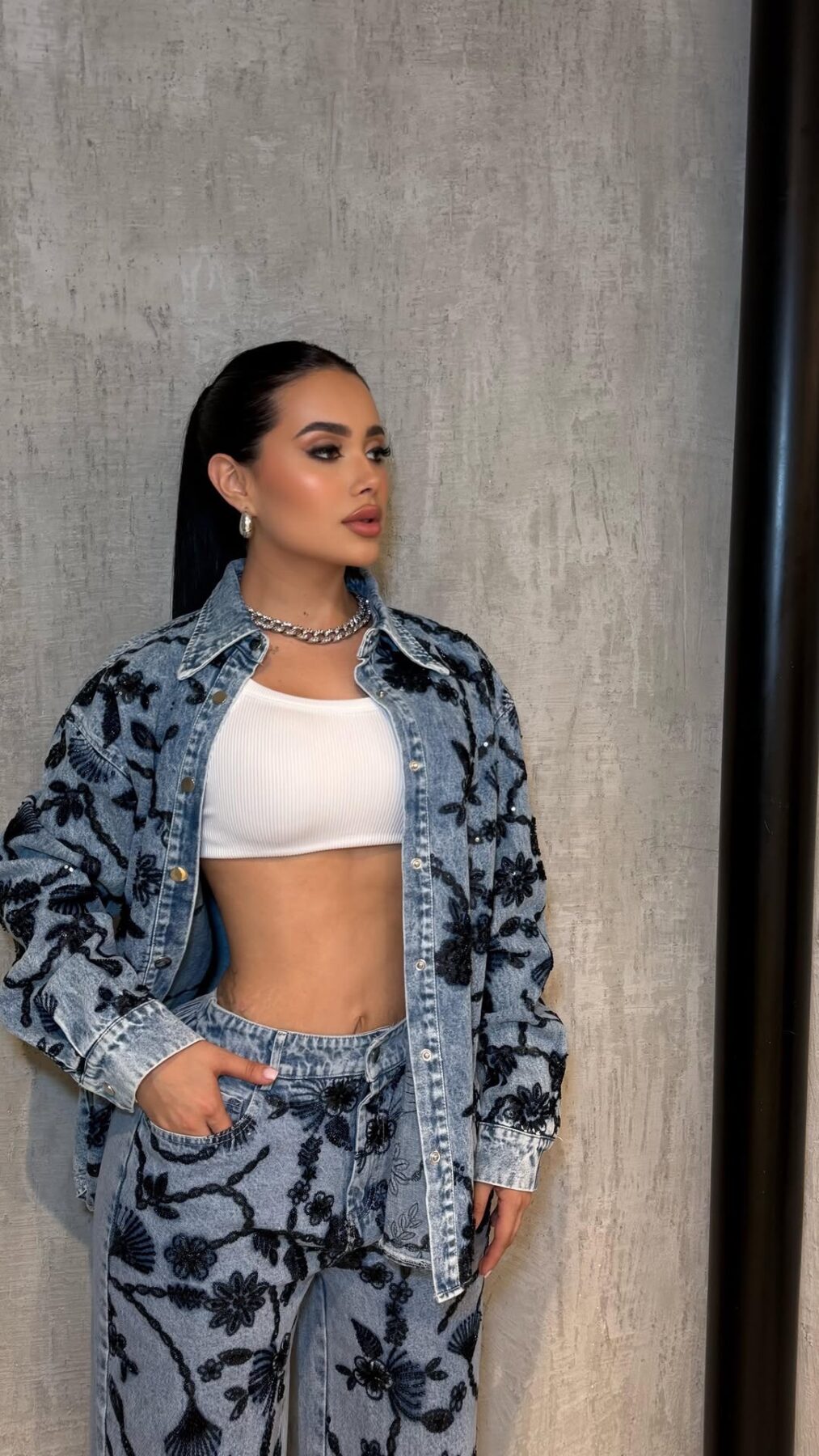 Conjunto jeans com bordado floral exclusivo. Elegancia e sofisticacao em cada detalhe.