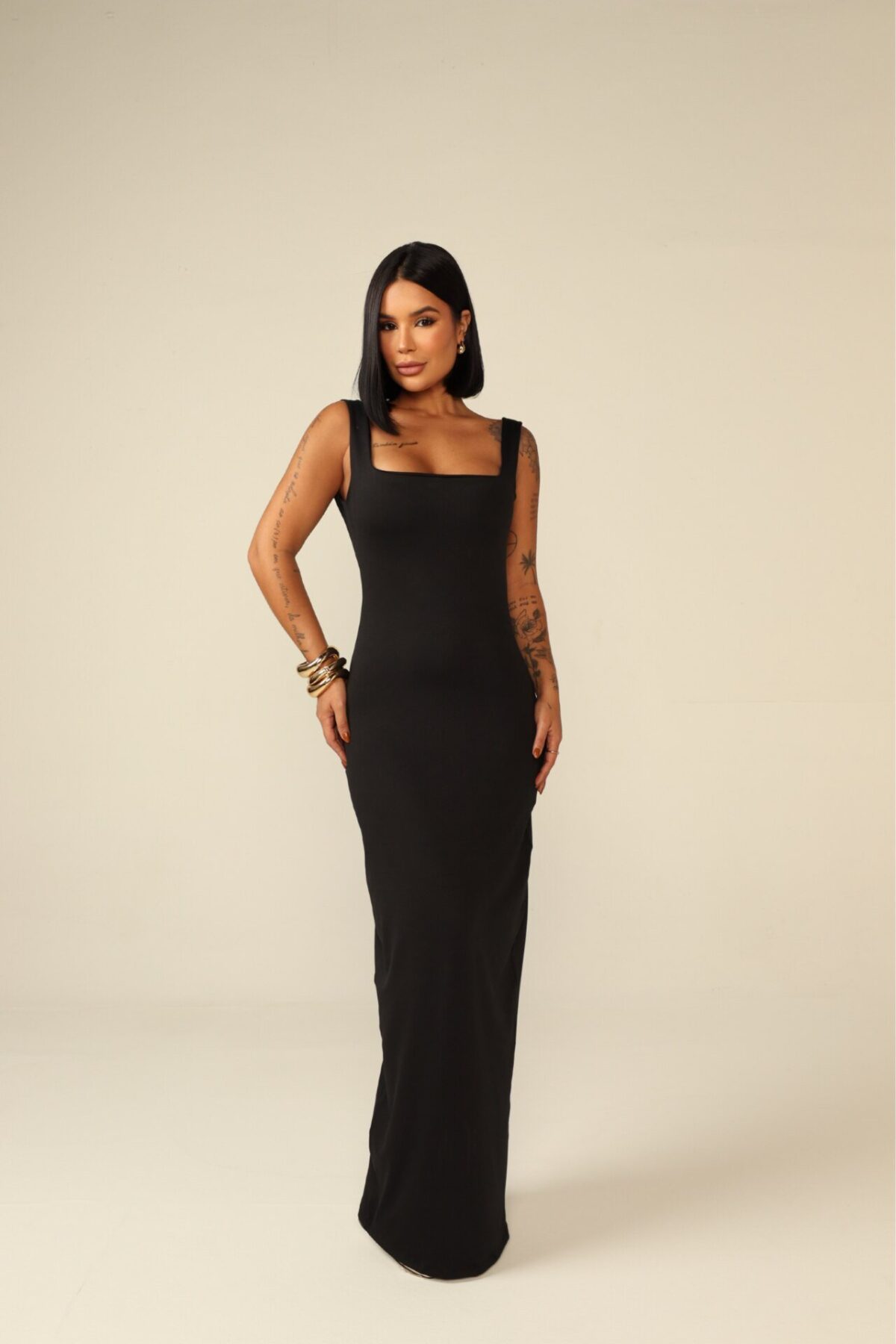 Vestido Longo com Costa Aberta Preto Feminino Elegante